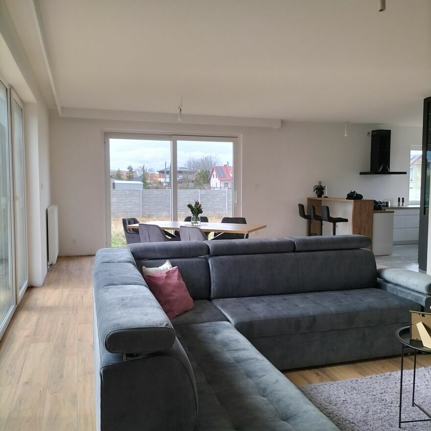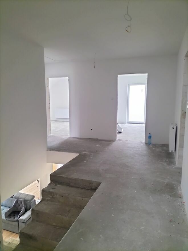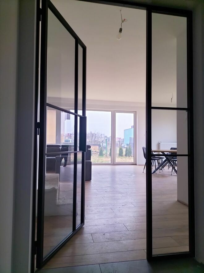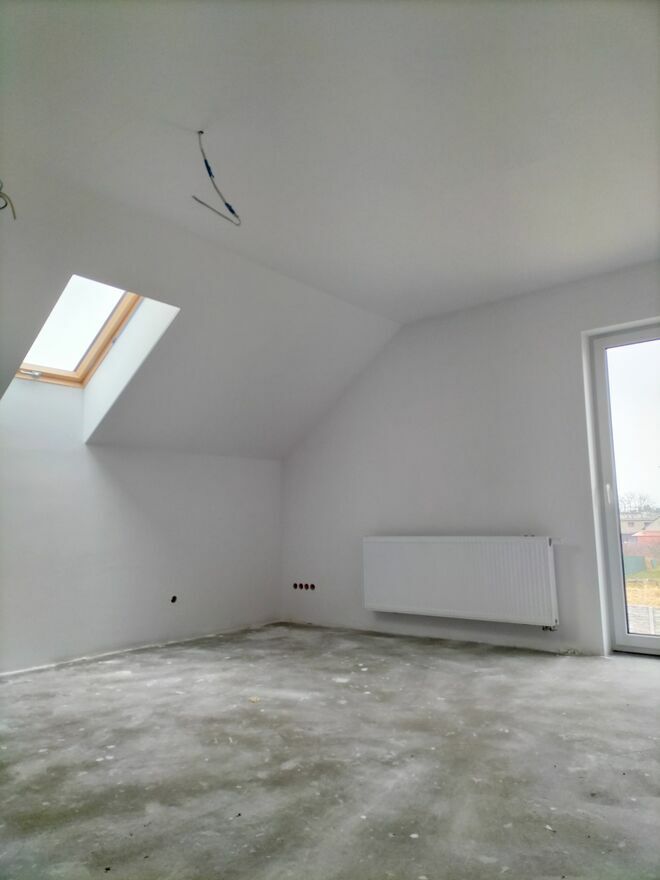 Dom wybudowany według indywidualnego projektu. Dojazd do nieruchomości odbywa się w większej części drogą gminną asfaltową, a ostatni odcinek utwardzoną drogą gruntową. Budynek posiada 2 kondygnacje : na pierwszej znajduje się garaż dwustanowiskowy o powierzchni 36 m2 oraz kotłownia 16m2 w której zamontowany jest piec na eko groszek(podłączone są grzejniki oraz ogrzewanie podłogowe). Parter to także duży salon z kuchnią, w pełni wyposażoną : meble robione na zamówienie u stolarza niska zabudowa to białe lakierowane fronty zaś wysoka to czarny mat (anty finger), blat drewnopodobny oraz witryna z czarnym przeszkleniem; wysokiej jakości sprzęt AGD (nigdy nie używane) zmywarka, płyta indukcyjna, okap, mikrofala, piekarnik oraz niestandardowa duża lodówka w zabudowie, zlew marki Franke, szafka na odpady z bardzo wygodnym otwieraniem tzw. servo drive. Dolna łazienka to w-c oraz umywalka nablatową z robioną na zamówienie szafką. Na parterze drzwi do łazienki i pomieszczenia gospodarczego firmy DRE, oraz loftowe drzwi oddzielające korytarz od reszty domu. W części mieszkalnej położony gres (oprócz garażu i kotłowni). Piętro (wymaga jeszcze wykończenia) położone gładzie i wymalowane na biało ściany, podzielone zostało na trzy wygodne pokoje (17m2 + garderoba 4 m2; 21 m2; 20 m2), łazienkę 17m2 oraz dodatkowe pomieszczenie - pralnia.