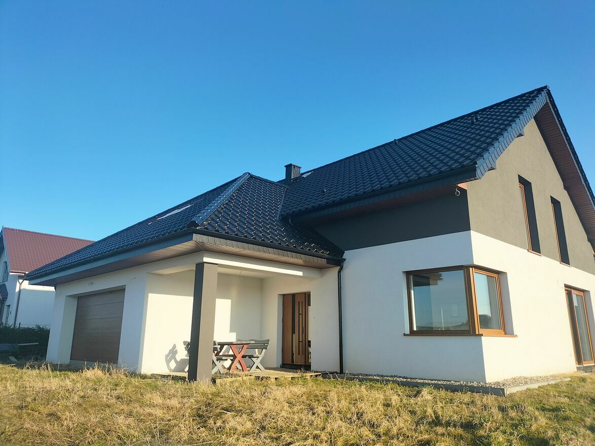 Na zewnątrz zamontowany został podziemny zbiornik wody deszczowej do którego odprowadzana jest woda z dachu. Dach pokryty dachówką ceramiczną serii Finesse w kolorze czarnym marki Creaton na którą udzielona została gwarancja na 50 lat. Okna dachowe marki Fakro, dolne przeszklenia z firmy Amar duże okno 4,5m, rozsuwany HS 3 metrowy, w kuchni okno narożne. W części dolnych okien rolety zewnętrzne. Cały budynek wykonany z wysokiej jakości materiałów. Więcej informacji udzielę telefonicznie.